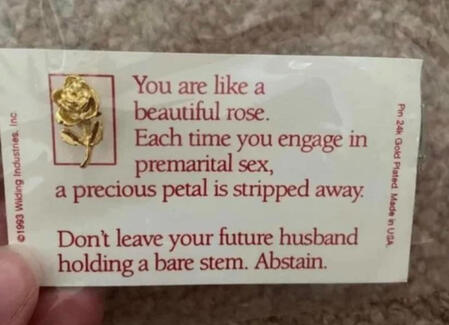 1. JESUS DIED FOR YOU 2. HELL IS REAL AND YOU WILL BURN AND GET RAPED 3. YOUR PURITYIS EVERYTHING